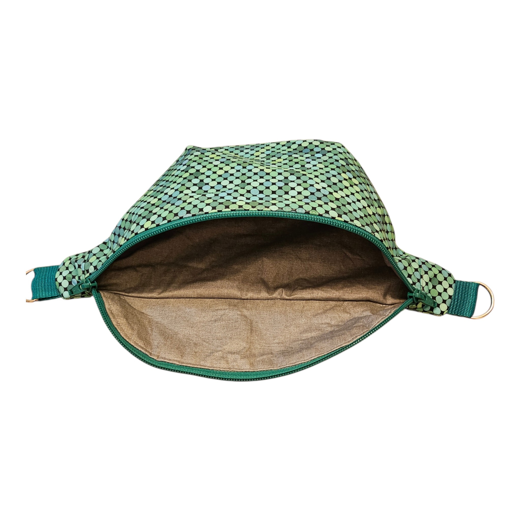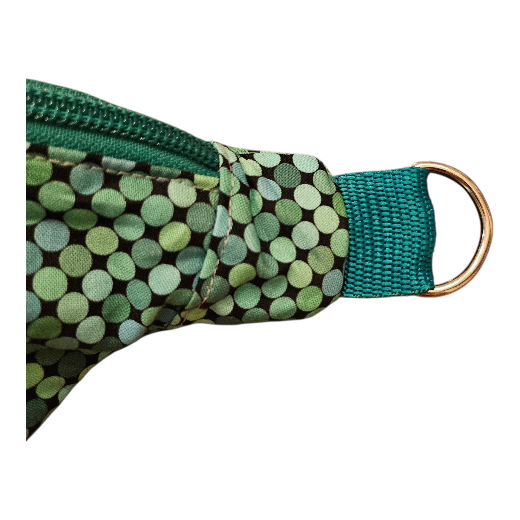 Selbstgenähte Bauchtasche mit gepunktetem Baumwollstoff, beschichtetem Baumwollstoff innen und grünem Tragegurt. Der Tragegurt ist in der Grösse verstellbar und kann nach Bedarf auch ausgewechselt werden.
